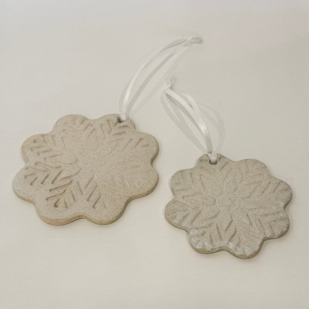 These ceramic flower-shaped Christmas ornaments, have a snow flake pattern and were glazed in matte turquoise or white, can be used as tree decorations, window hangings, mobiles or gift tags.